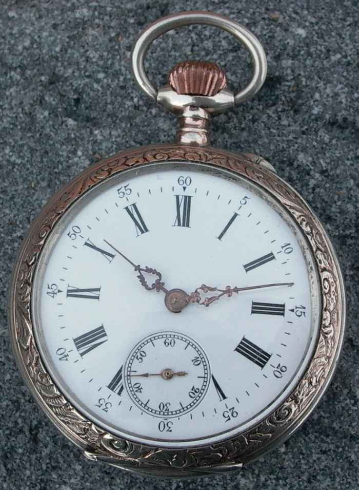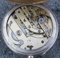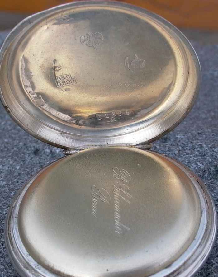 Eine sehr spezielle Silber-Taschenuhr mit besonderer Hemmung Ein Umbau auf Ankergang mit Zylinderrad und der Zylinderunruhe, intakt Innendeckel signiert: B. Schumacher, Bonn