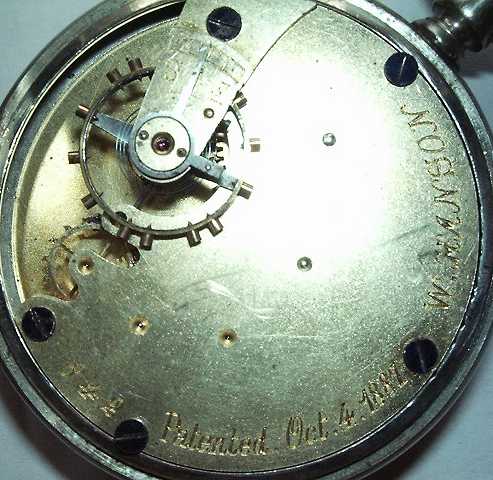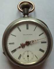 Nickelgehäuse intakte Stiftanker-Hemmung besondere Zeigerstellung durch Zahnrad bei der 12 Patent von 1887 zugänglich nach öffnen des Glasrands Diese Uhr ist verkauft Zum Vergrößern bitte Bild anklicken.